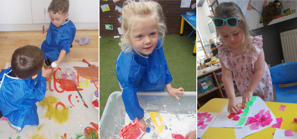 They have had lots of messy play using a wide variety of resources to explore different patterns, pictures and textures. The children added paper to the garden fence outside and used crayons to make marks; they enjoyed practising writing their letters on uneven surfaces and there were giggles all round whilst drawing "wibbly wobbly" letters!